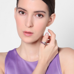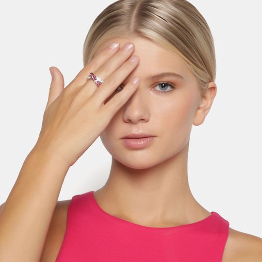 Elegante anillo en baño de oro blanco de 18 quilates , diseño de argolla cruzada cristales rosas e incrustaciones de cristales blancos. Fabricado en una estructura de aleación de platino con rodio sin níquel.