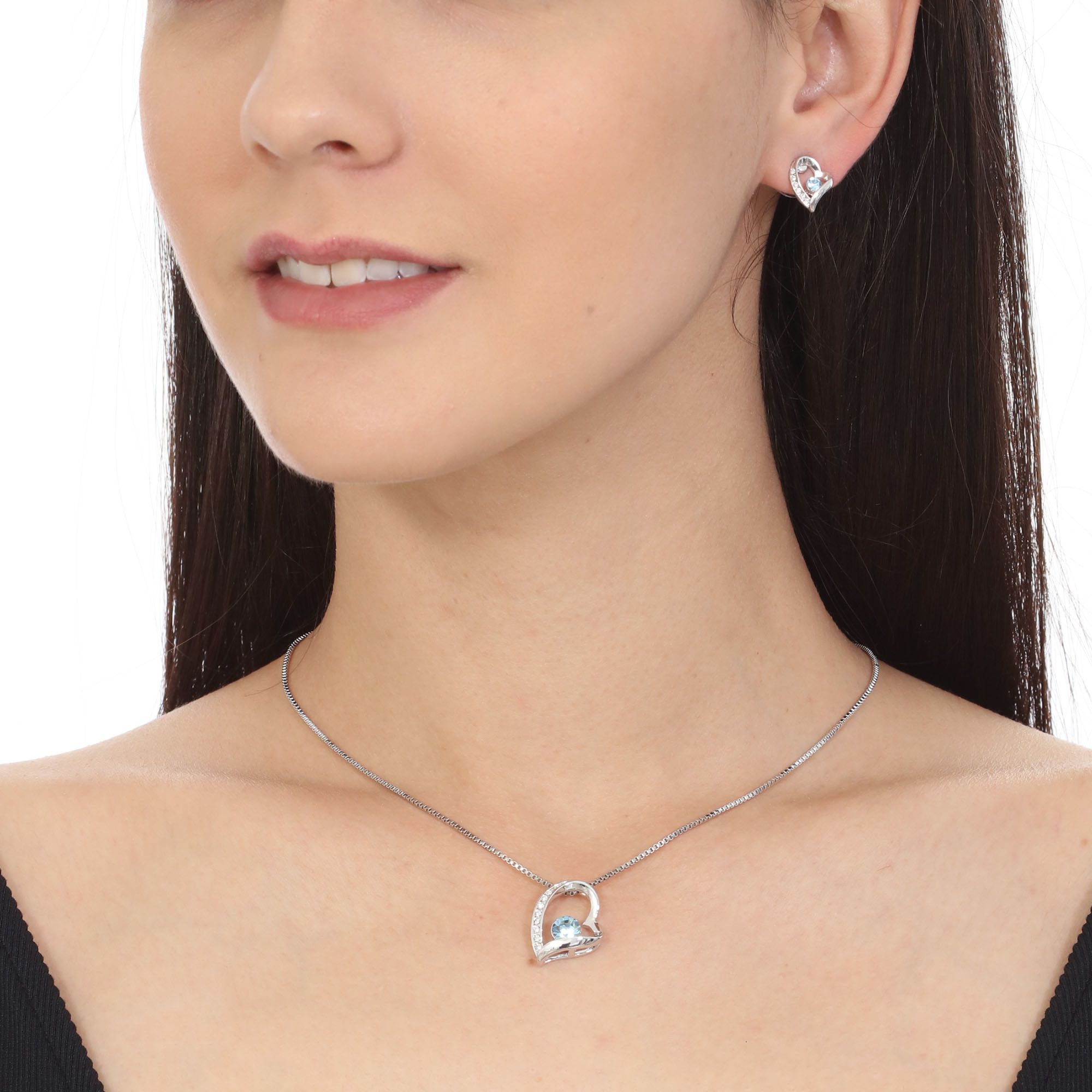 Tierno y elegante conjunto de dije con cadena y aretes en baño de oro blanco de 18 quilates, diseño de corazón estilizado, con cristal azul corte brillante al centro e incrustaciones de cristales en color blanco. Fabricado en una estructura de aleación de platino con rodio sin níquel.