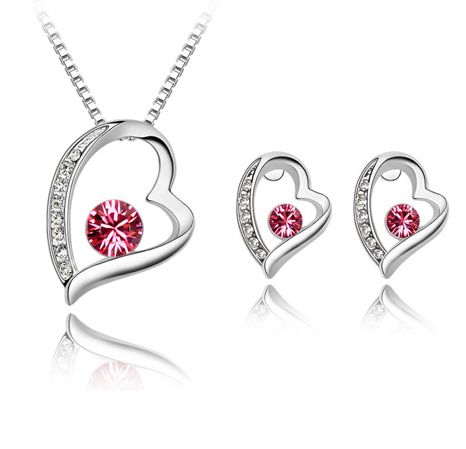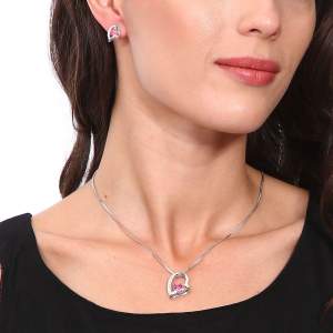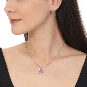 Tierno y elegante conjunto de dije con cadena y aretes en baño de oro blanco de 18 quilates, diseño de corazón estilizado, con cristal rosa corte brillante al centro e incrustaciones de cristales en color blanco. Fabricado en una estructura de aleación de platino con rodio sin níquel.