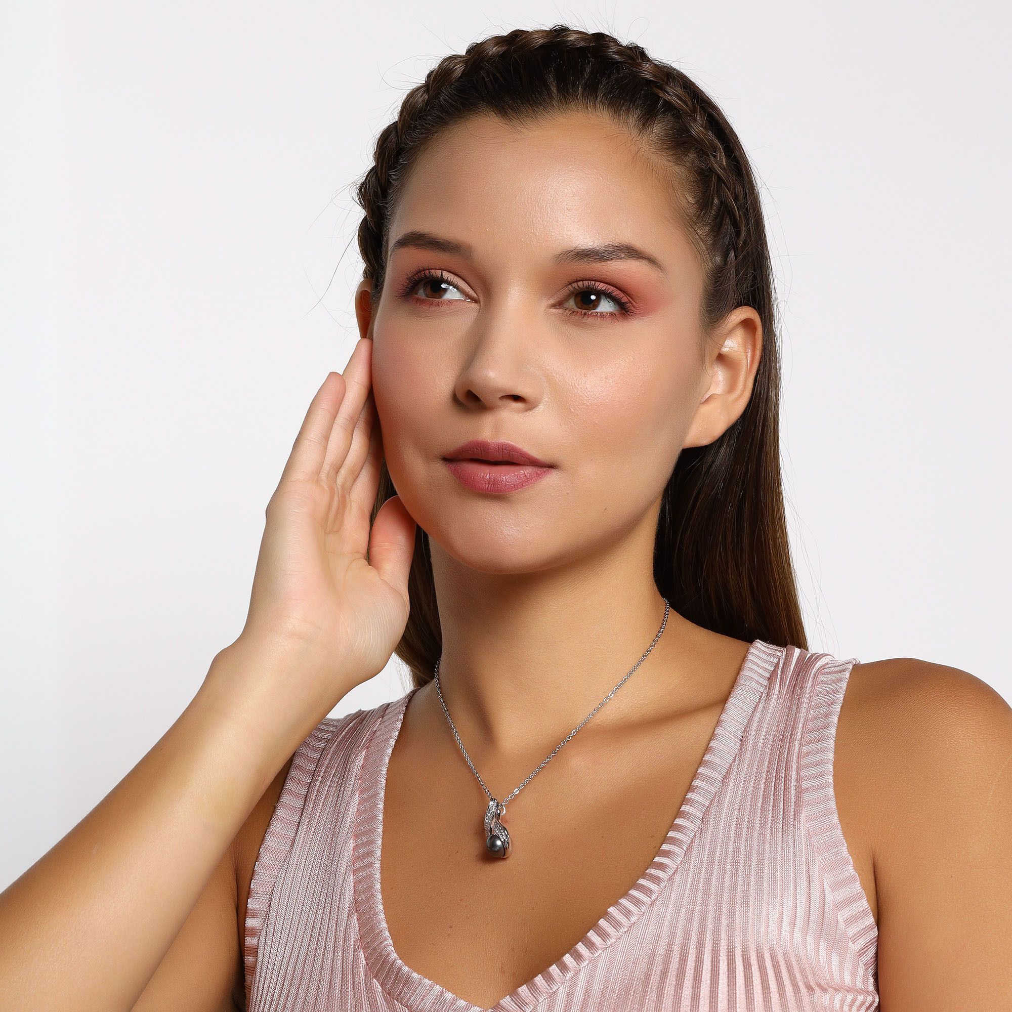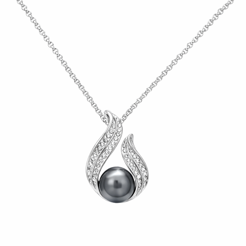 Exquisito dije en baño de oro blanco de 18 quilates, con una delicada perla color negro e incrustaciones de cristales en color blanco. Fabricado en una estructura de aleación de platino con rodio sin níquel.