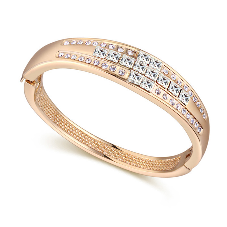 Hermoso brazalete en baño de oro amarillo de 18 quilates, con incrustaciones de cristales en color blanco. Fabricado en una estructura de aleación de platino con rodio sin níquel.