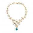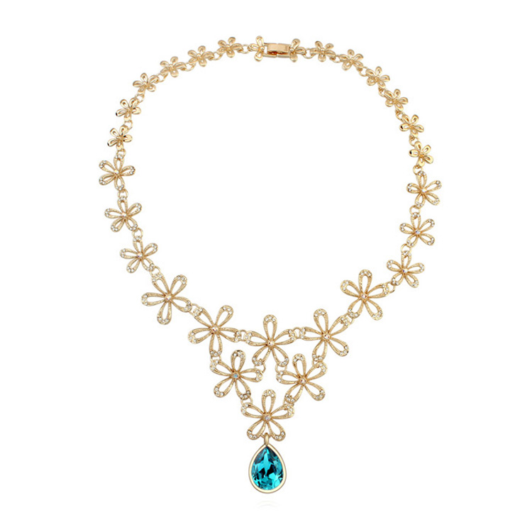 Exquisito collar en baño de oro amarillo de 18 quilates, fino diseño de flores con incrustaciones de cristales en color azul y blanco. Fabricado en una estructura de aleación de platino con rodio sin níquel.