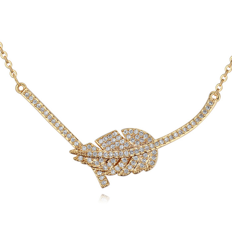 Hermoso collar en baño de oro Amarillo de 18 quilates, diseño de pluma, con incrustaciones de cristales en color blanco. Fabricado en una estructura de aleación de platino con rodio sin níquel.