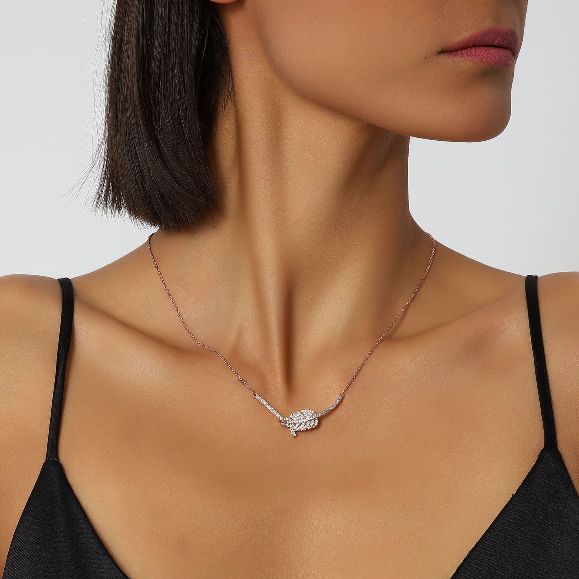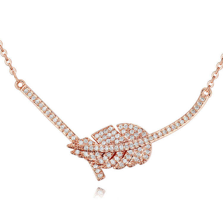 Hermoso collar en baño de oro Rosa de 18 quilates, diseño de pluma, con incrustaciones de cristales en color blanco. Fabricado en una estructura de aleación de platino con rodio sin níquel.