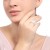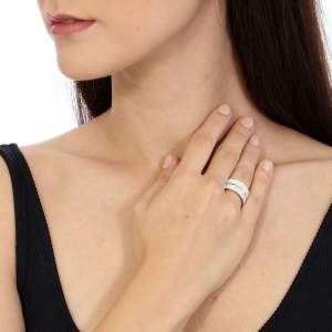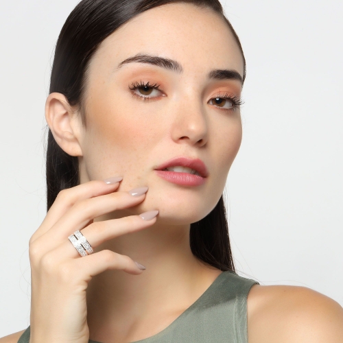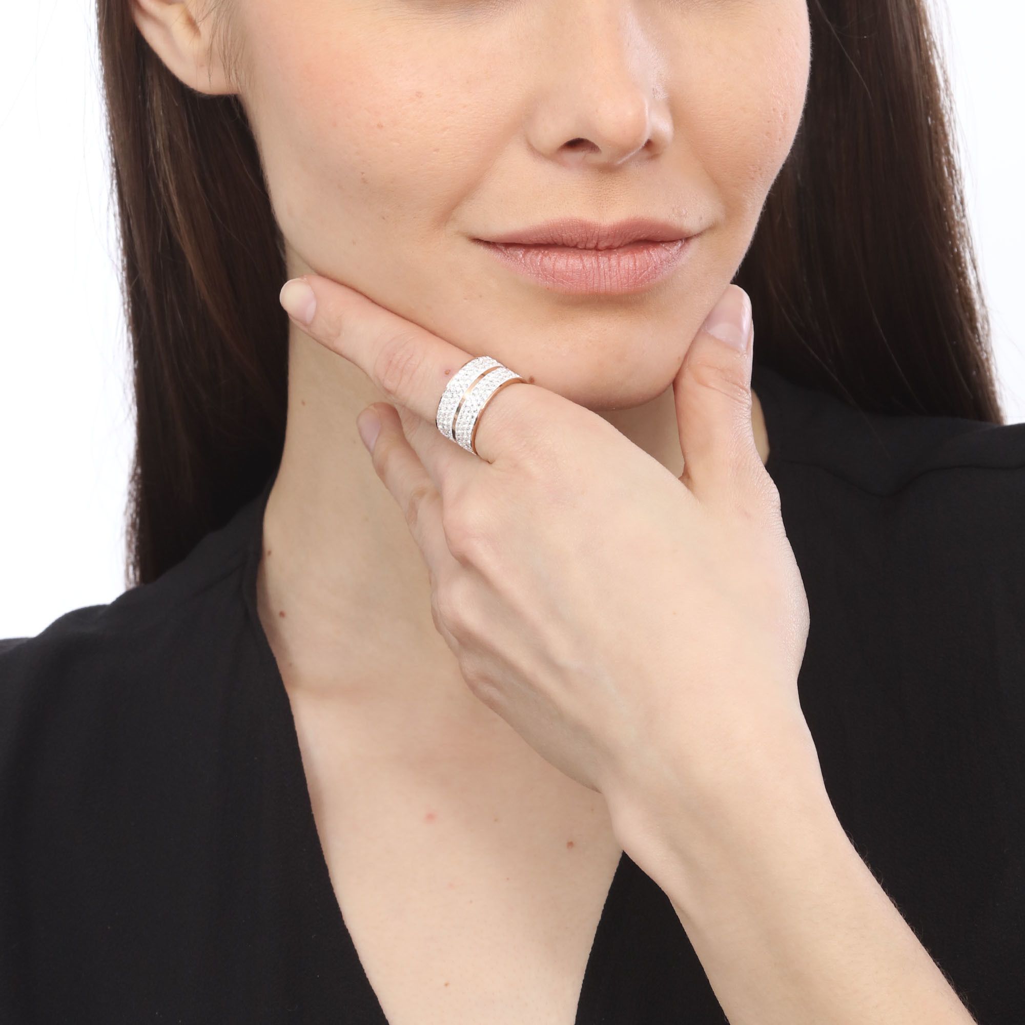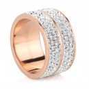 Elegante anillo en acero inoxidable, acabado rosa, diseño estilo doble, con hileras de cristales en color blanco.