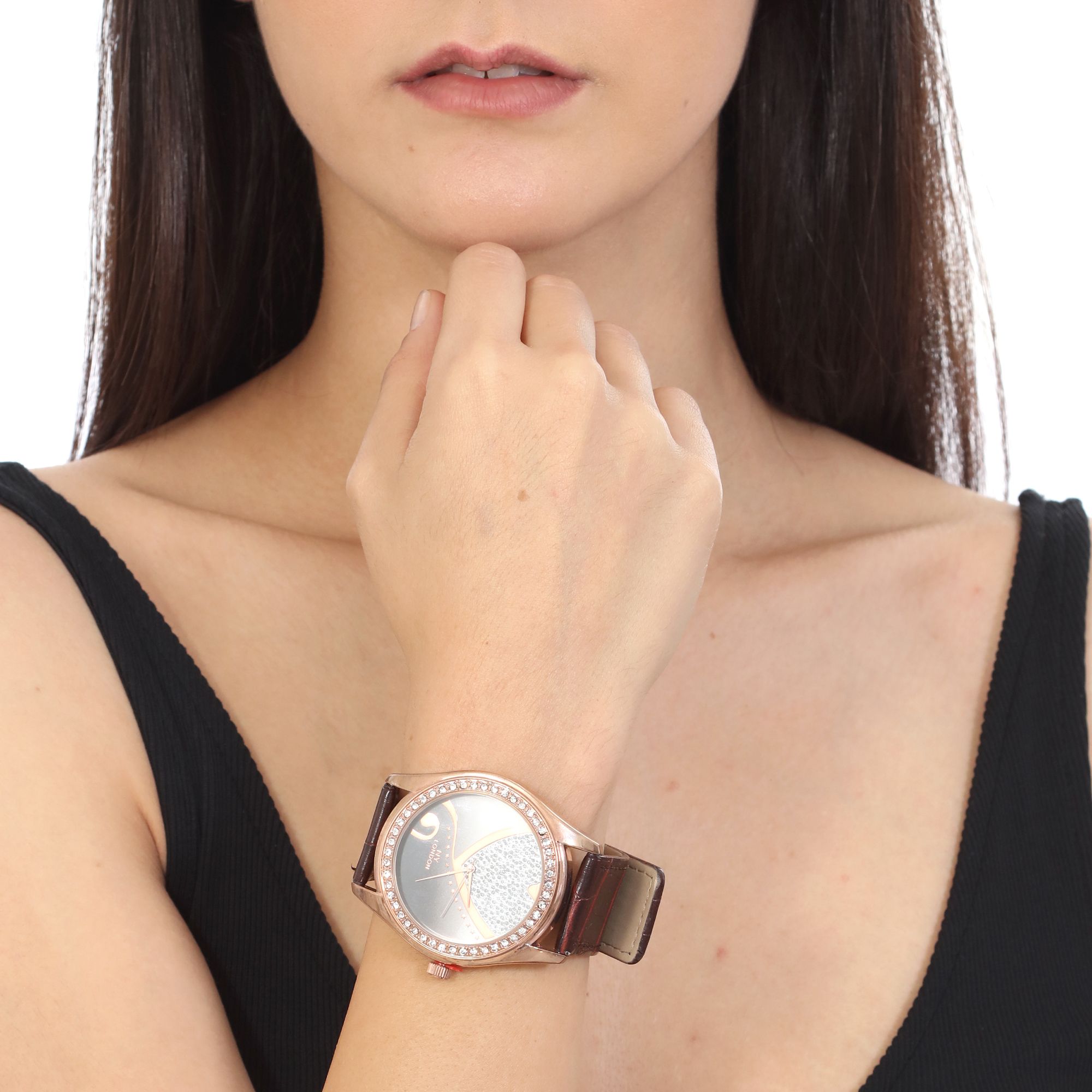 Reloj NY, con detalles de baño de oro amarillo de 18 quilates , con detalle de corazón e incrustaciones de cristales en color blanco, y correa disponible en colores rosa, blanco, negro y café con textura tipo piel de reptil.