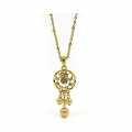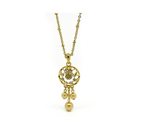 Original y fino dije en baño de oro amarillo de 18 quilates, diseño de atrapa sueños con perlas miel e incrustaciones de cristales blancos. Fabricado en una estructura de aleación de platino con rodio sin níquel.