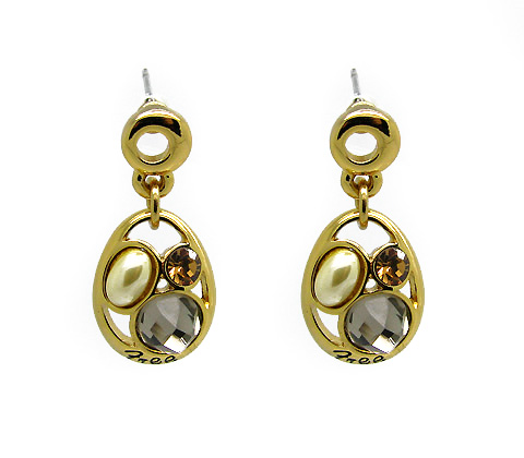 Bonitos aretes en baño de oro amarillo de 18 quilates, diseño de gota con perla, cristal ámbar, cristal humo y grabado con la palabra "free". Fabricado en una estructura de aleación de platino con rodio sin níquel.
