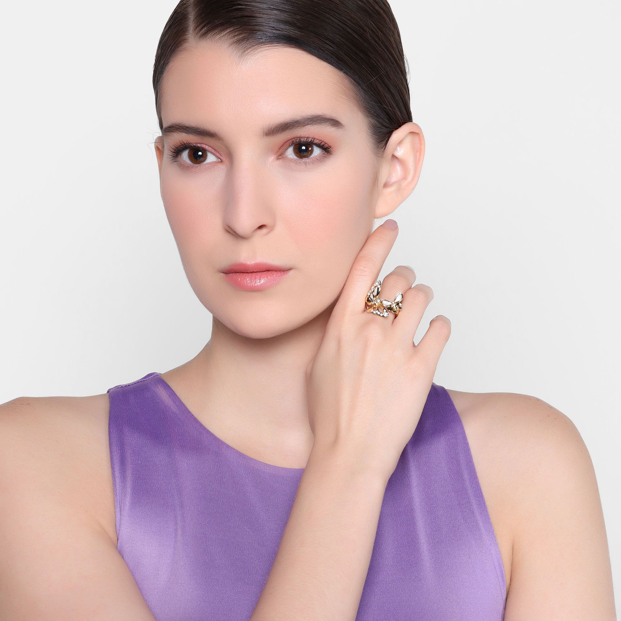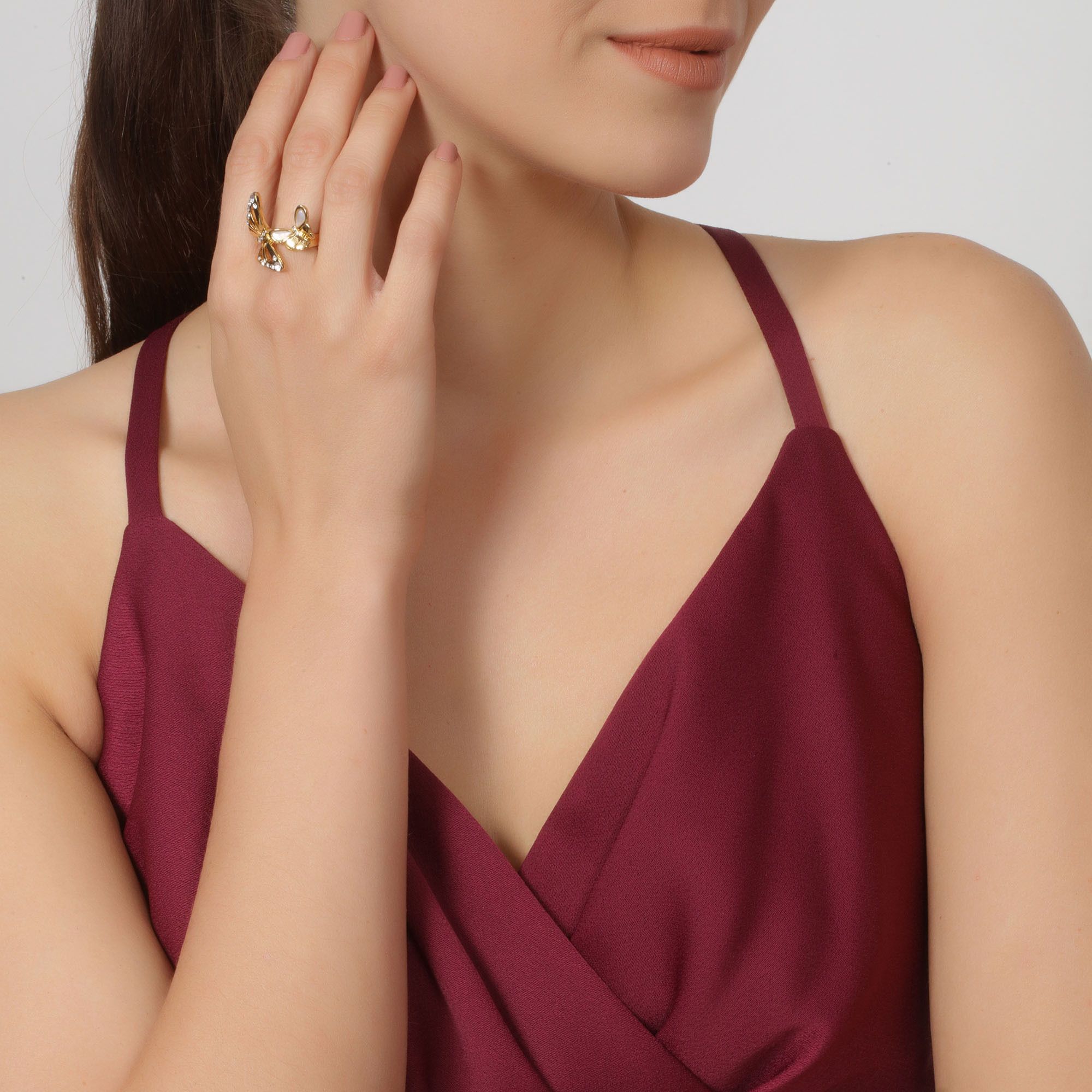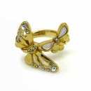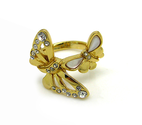 Bonito anillo en baño de oro amarillo de 18 quilates, con mariposas doradas, nacarado color blanco e incrustaciones de cristales blancos. Fabricado en una estructura de aleación de platino con rodio sin níquel.