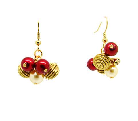 Bonitos aretes en baño de oro amarillo de 18 quilates con perlas rojas, blancas y esferas doradas. Fabricado en una estructura de aleación de platino con rodio sin níquel.