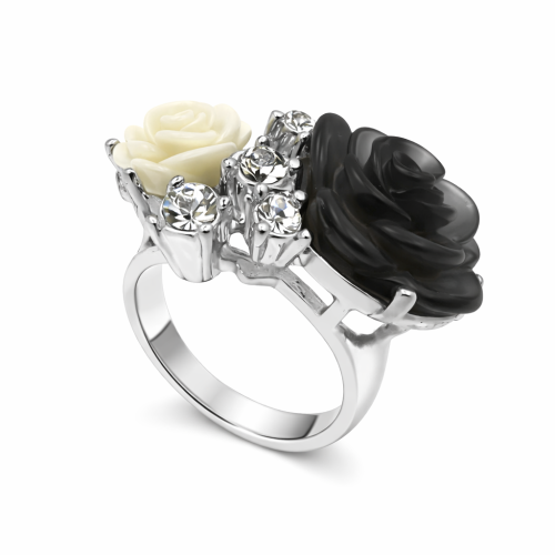 Elegante anillo, en baño de oro blanco de 18 quilates, con rosa de cristal opaco color negro, rosa de cristal sólido color blanco e incrustaciones de cristales blancos. Fabricado en una estructura de aleación de platino con rodio sin níquel.