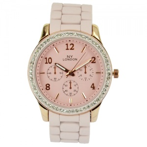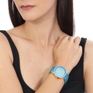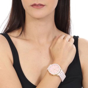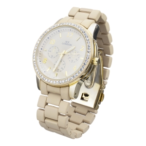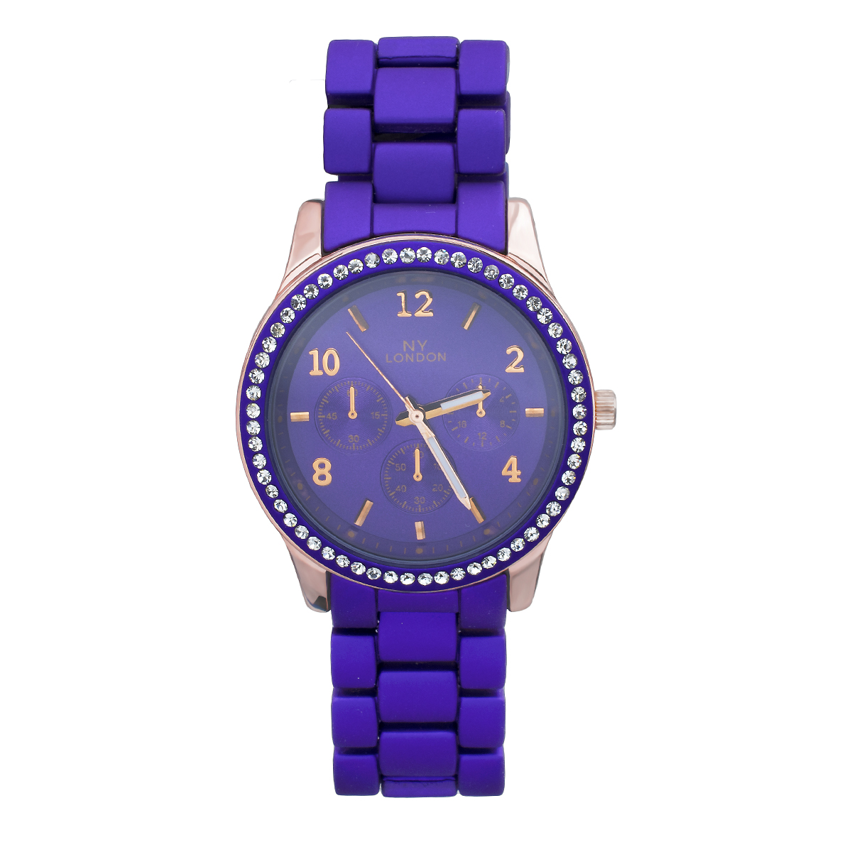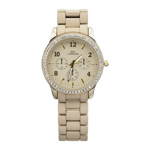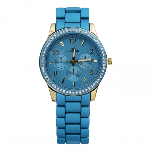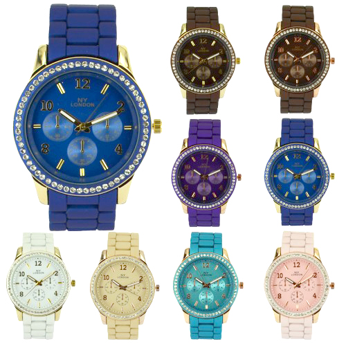Reloj NY, elaborado de cerámica con detalles en baño de oro amarillo de 18 quilates e incrustaciones de cristales blancos. Con correa de plástico, disponible en colores azul, café, morado, blanco, beige, aqua y rosa.
