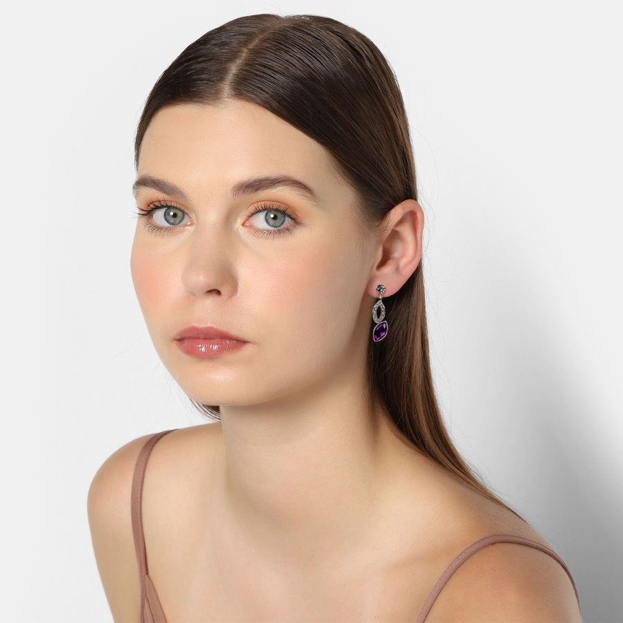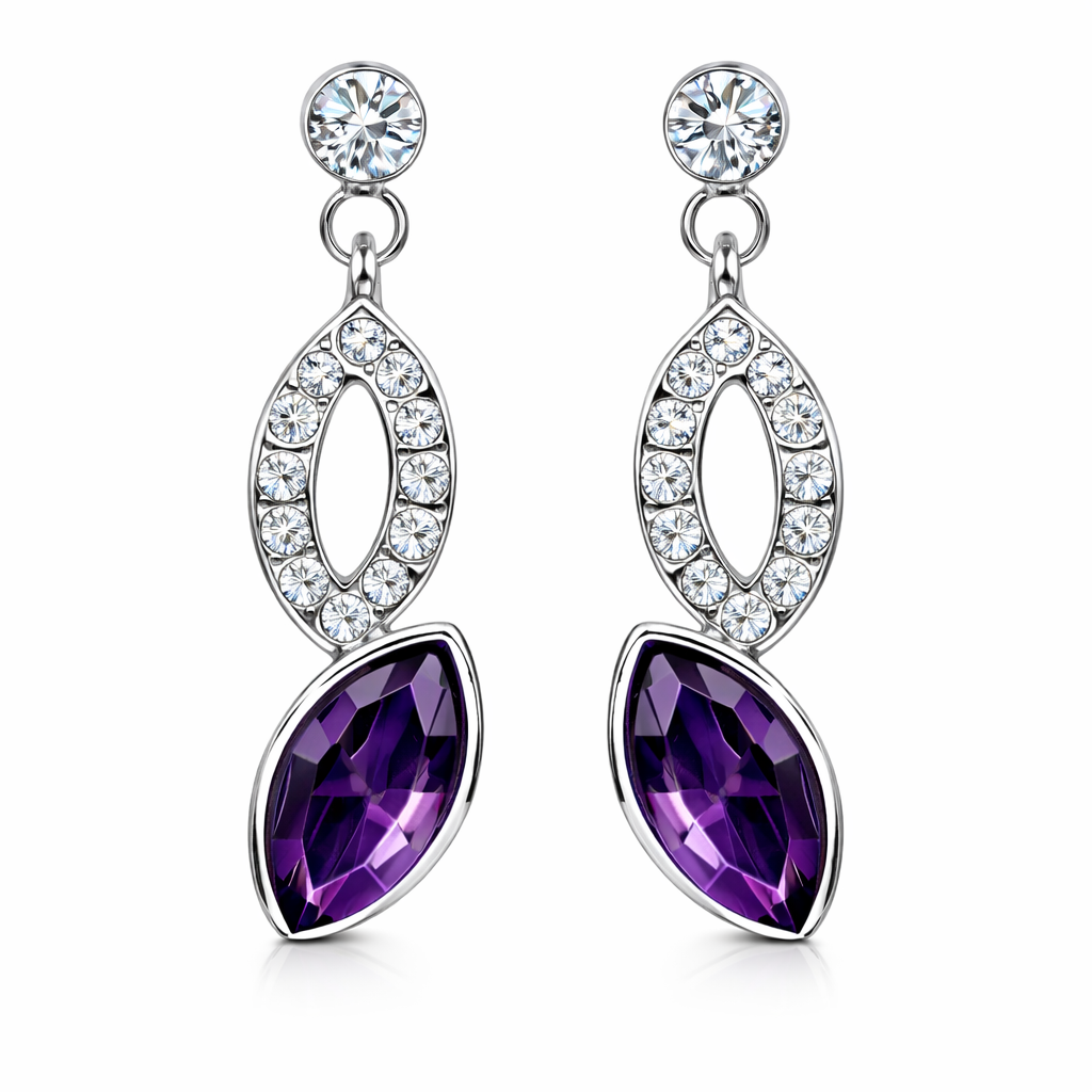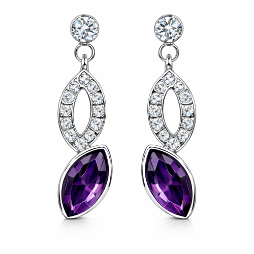 Finos aretes en baño de oro blanco de 18 quilates, diseño en forma de hojas con incrustaciones de cristales en color purpura y blanco. Fabricado en una estructura de aleación de platino con rodio sin níquel.
