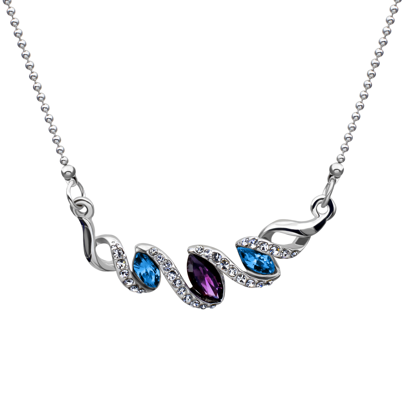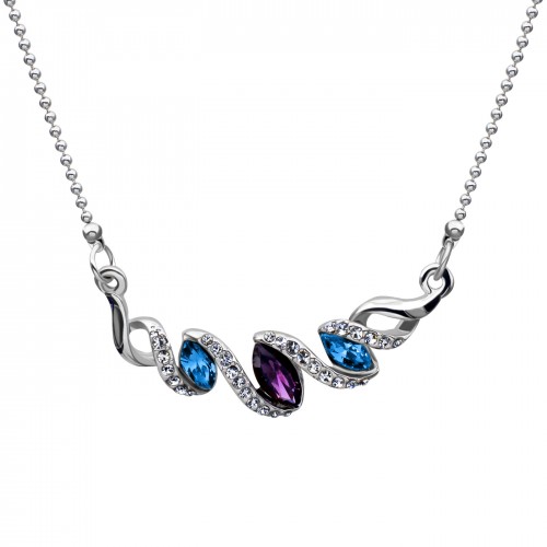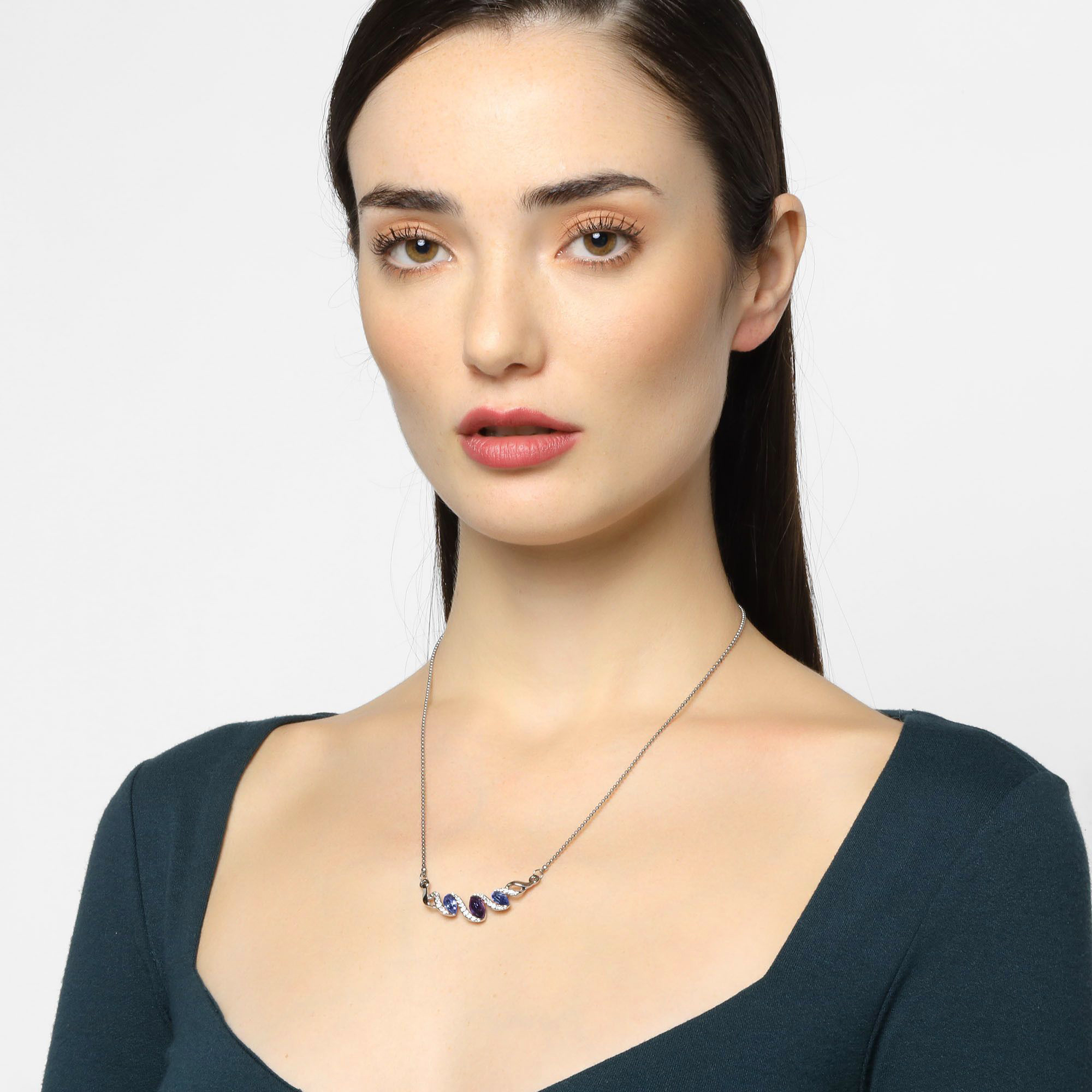 Collar en baño de oro blanco de 18 quilates, fino diseño de lazo con incrustaciones de cristales en color azul, blanco y morado. Fabricado en una estructura de aleación de platino con rodio sin níquel.