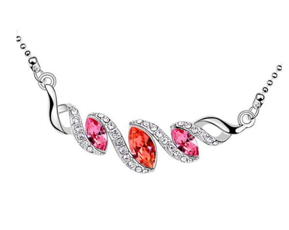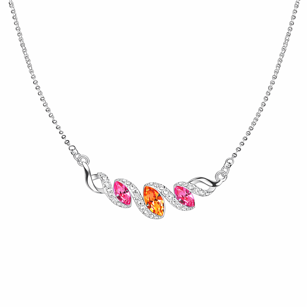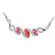 Collar en baño de oro blanco de 18 quilates, fino diseño de lazo con incrustaciones de cristales en color blanco, naranja y rosa. Fabricado en una estructura de aleación de platino con rodio sin níquel.