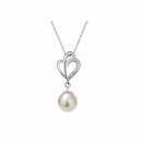 Estilizado dije con diseño de un pequeño corazón en baño de oro blanco de 18 quilates, con incrustaciones de cristales en color blanco y perla blanca. Fabricado en una estructura de aleación de platino con rodio sin níquel.