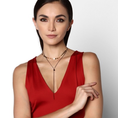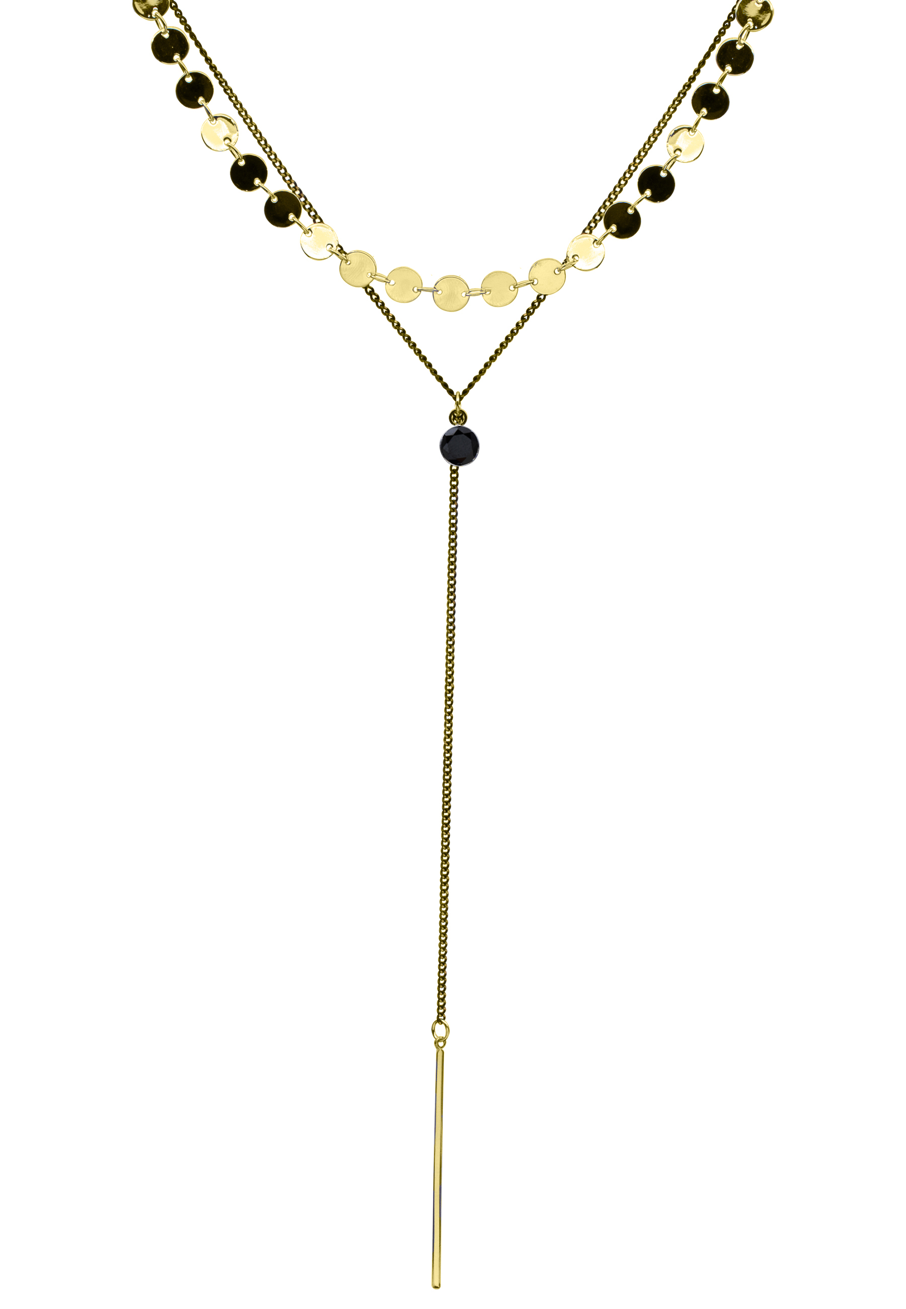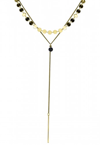 Collar en baño de oro amarillo de 18 quilates, original diseño con cadena negra, gargantilla estilo pailette en dorado y cristal negro. Fabricado en una estructura de aleación de platino con rodio sin níquel.
