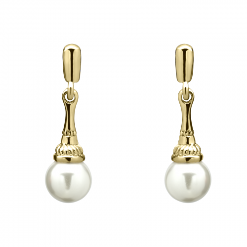 Elegantes aretes en baño de oro amarillo de 18 quilates, detalle de perla blanca. Fabricado en una estructura de aleación de platino con rodio sin níquel.