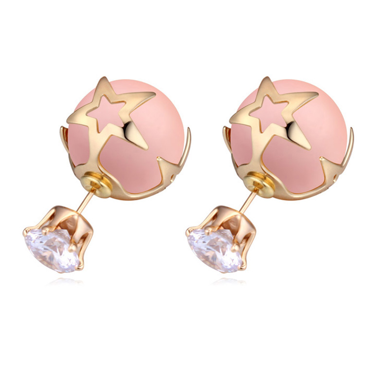 Lindos aretes en baño oro amarillo de 18 quilates, diseño de estrella con perla rosa y cristal en color blanco corte brillante. Fabricado en una estructura de aleación de platino con rodio sin níquel.