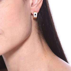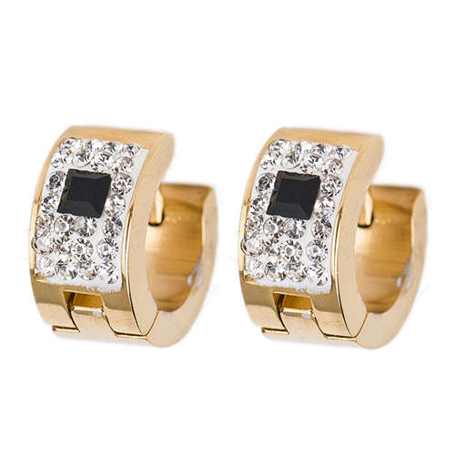 Aretes de acero inoxidable en color amarillo, diseño estilo arracadas, con cristal negro corte princesa e incrustaciones de cristales en color blanco.