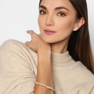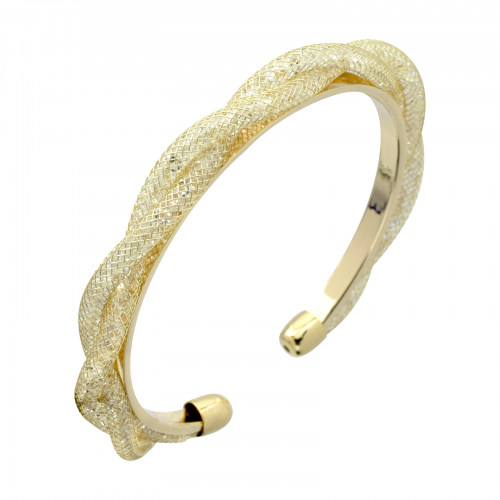 Lindo brazalete en baño de oro amarillo de 18 quilates, diseño de red entrelazada con cristales dentro en color blanco. Fabricado en una estructura de aleación de platino con rodio sin níquel.