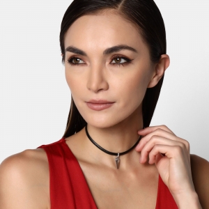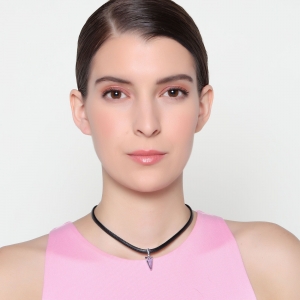 Original collar con detalles en baño de oro blanco de 18 quilates, diseño de pequeño triangulo de cristal azul, con correa negra e incrustraciones de cristales blancos. Fabricado en una estructura de aleación de platino con rodio sin níquel.