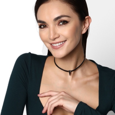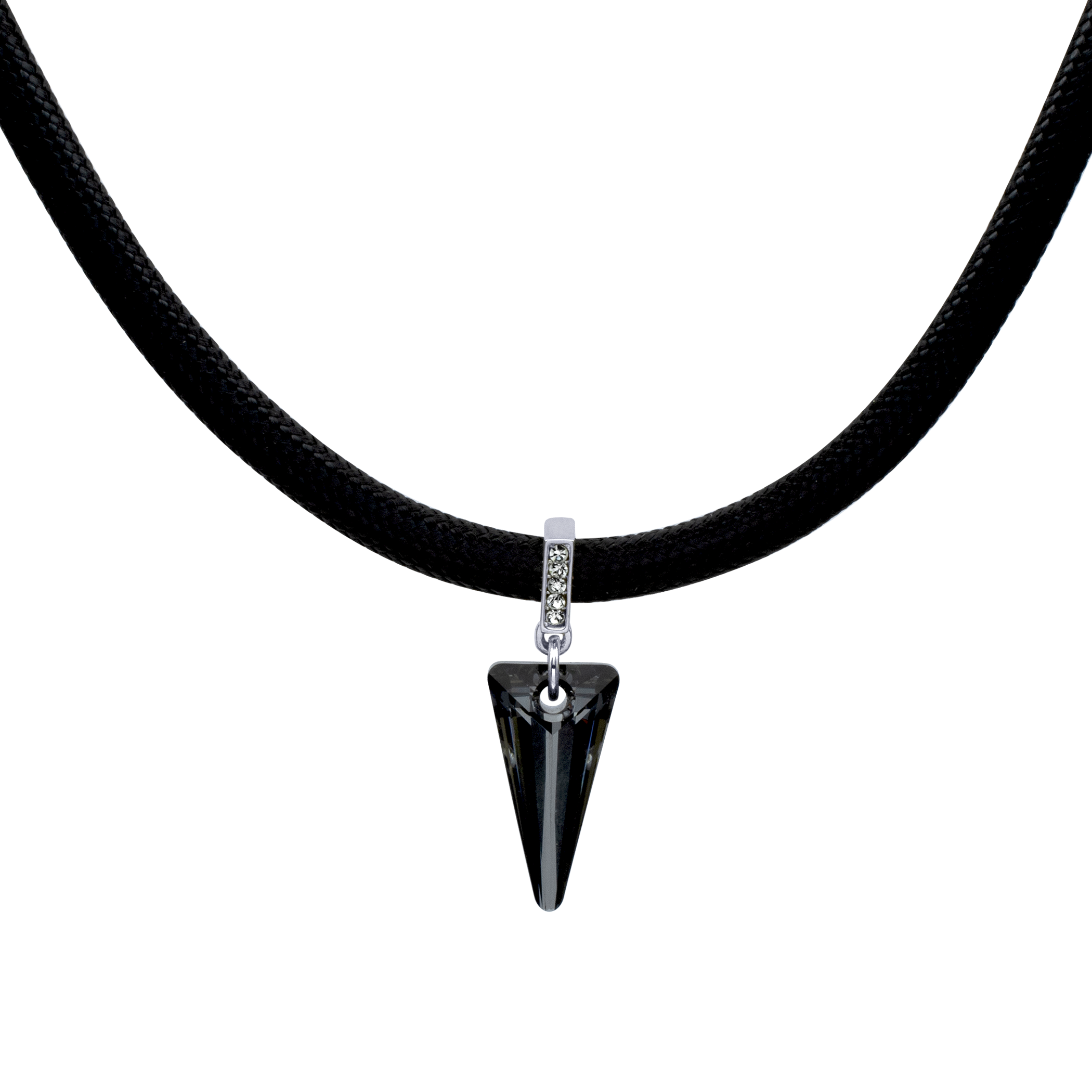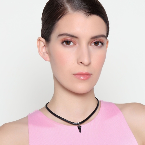 Original collar con detalles en baño de oro blanco de 18 quilates, diseño de pequeño triangulo de cristal humo, con correa negra e incrustraciones de cristales blancos. Fabricado en una estructura de aleación de platino con rodio sin níquel.