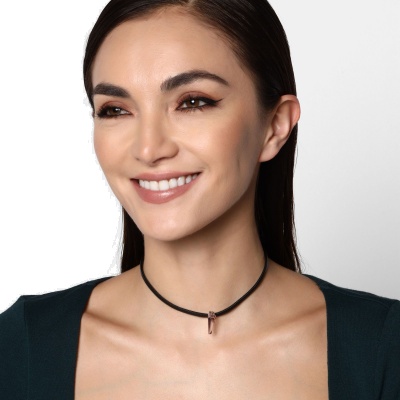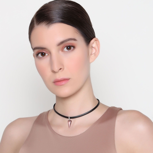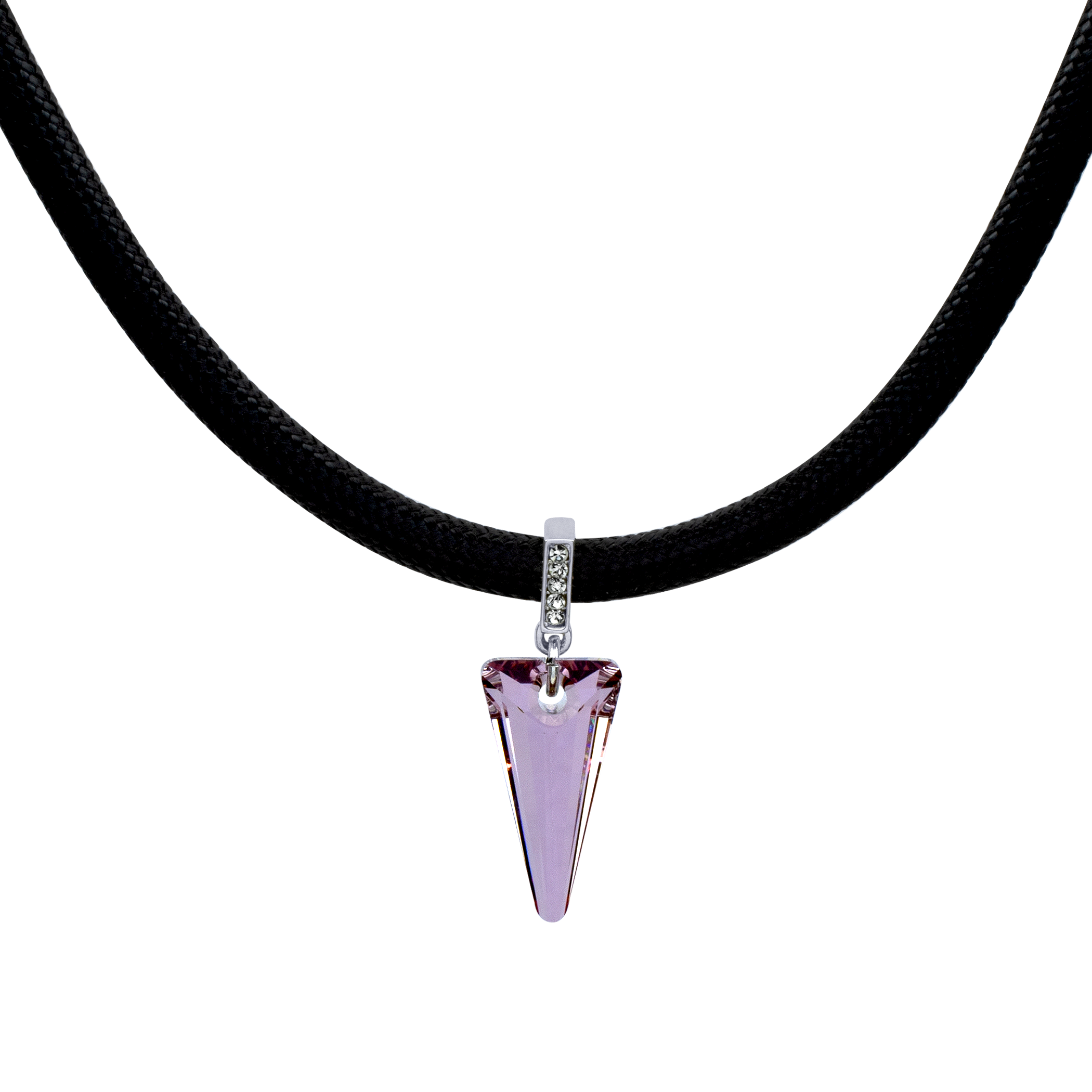 Original collar con detalles en baño de oro blanco de 18 quilates, diseño de pequeño triangulo de cristal rosa, con correa negra e incrustraciones de cristales blancos.. Fabricado en una estructura de aleación de platino con rodio sin níquel.