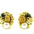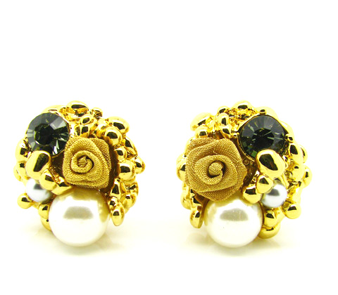 Exclusivos y originales aretes en baño de oro amarillo de 18 quilates con rosa dorada, cristal humo, perla e incrustaciones de cristales. Fabricado en una estructura de aleación de platino con rodio sin níquel.