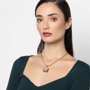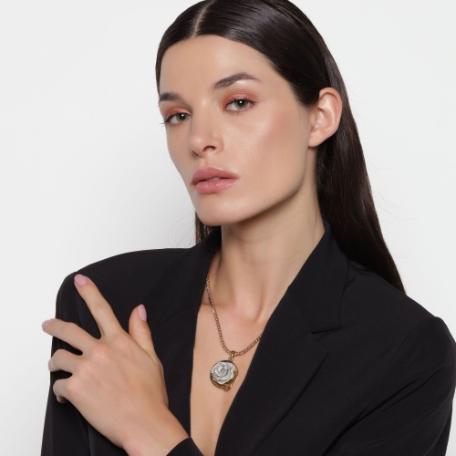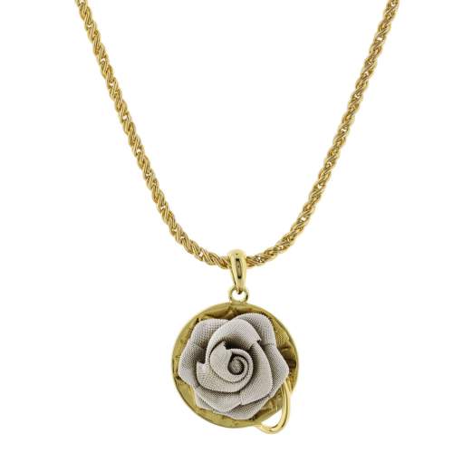 Original y fino collar en baño de oro amarillo de 18 quilates, diseño de círculo dorado con rosa plateada hecha de malla. Fabricado en una estructura de aleación de platino con rodio sin níquel.
