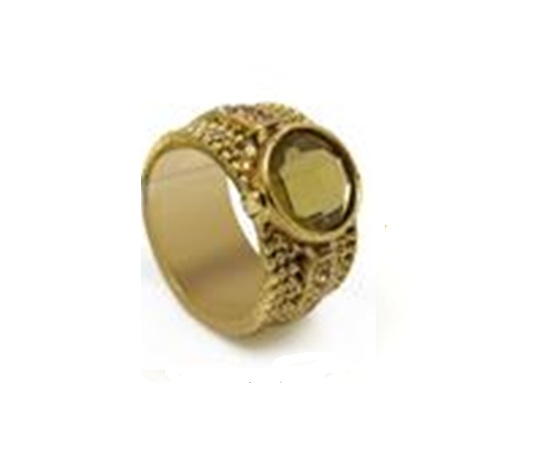 Bonito anillo en baño de oro amarillo de 18 quilates, con cristal olivo, detalles en relieve e incrustaciones de cristales blancos. Fabricado en una estructura de aleación de platino con rodio sin níquel.