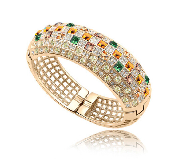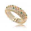 Brazalete en baño de oro amarillo de 18 quilates, fino diseño con incrustaciones de cristales corte princesa en colores ámbar, blanco y verde. Fabricado en una estructura de aleación de platino con rodio sin níquel.