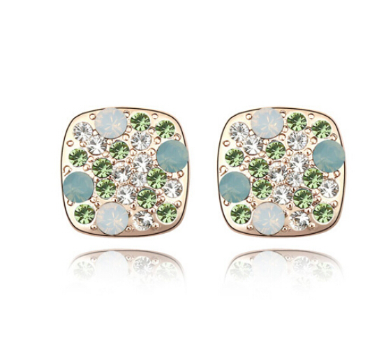Aretes en baño de oro amarillo de 18 quilates, diseño de cuadro con incrustaciones de cristales en color blanco, blanco opaco y verde. Fabricado en una estructura de aleación de platino con rodio sin níquel.