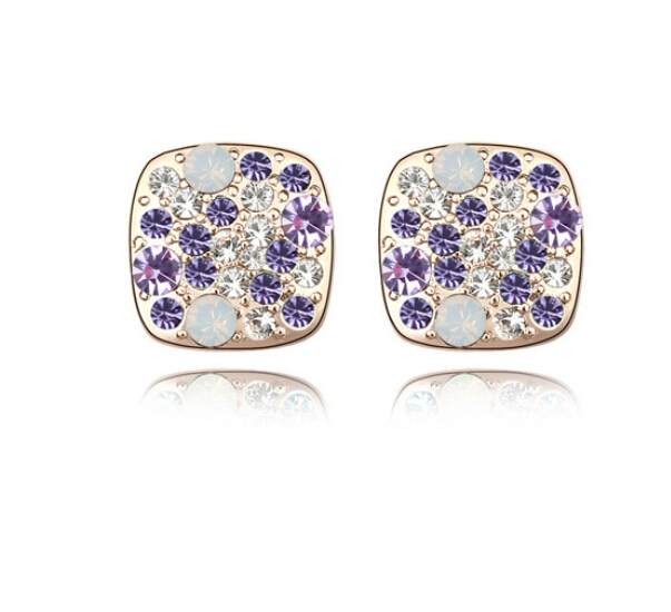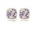 Aretes en baño de oro amarillo de 18 quilates, diseño de cuadro con incrustaciones de cristales en color blanco, blanco opaco y morado. Fabricado en una estructura de aleación de platino con rodio sin níquel.