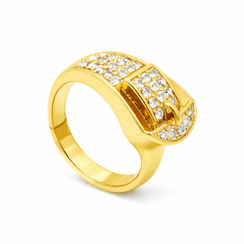 Elegante anillo, en baño de oro amarillo de 18 quilates, diseño estilo hebilla, en relieve e incrustaciones de cristales blancos. Fabricado en una estructura de aleación de platino con rodio sin níquel.