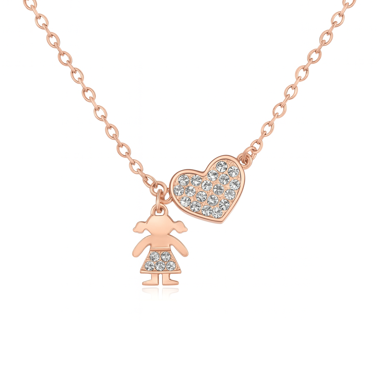 Tierno dije en baño de oro rosa de 18 quilates, diseño de corazón y niña con incrustaciones de cristales en color blanco Fabricado en una estructura de aleación de platino con rodio sin níquel.
