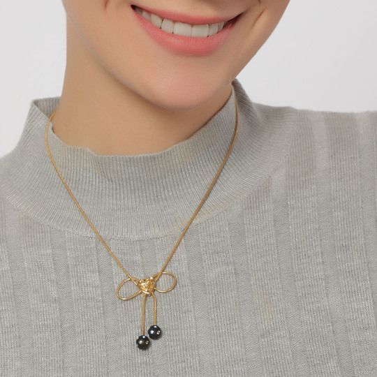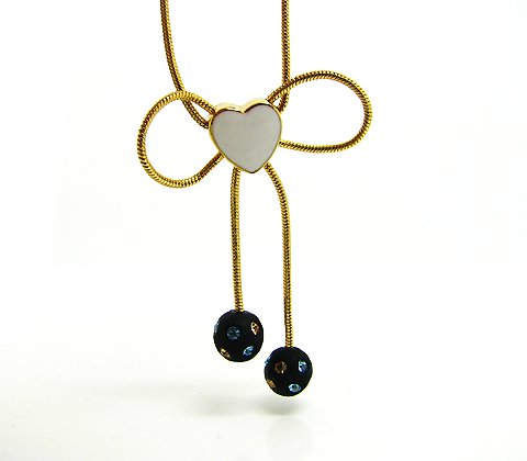 Bonita collar en baño de oro amarillo de 18 quilates con cristales negros, corazón esmaltado e incrustaciones de cristales blancos. El collar tiene una cadena de 40 cm con extensión de 5 cm. Fabricado en una estructura de aleación de platino con rodio sin níquel.