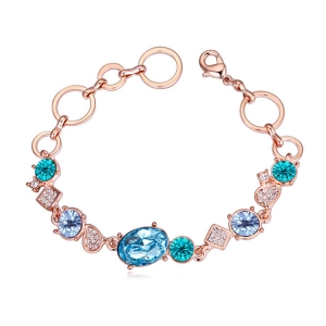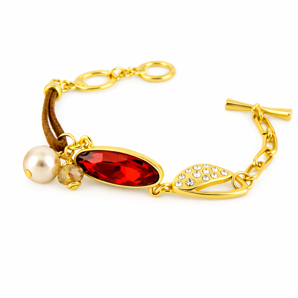 Bonito brazalete en baño de oro amarillo de 18 quilates, con cristal rojo en forma de óvalo, correa de cuero color chocolate, perla blanca e incrustaciones de cristales blancos. Fabricado en una estructura de aleación de platino con rodio sin níquel.