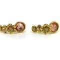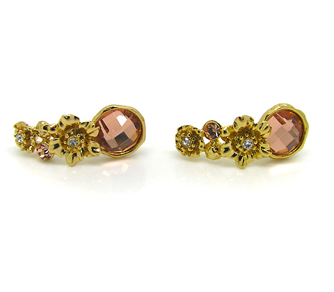 Elegantes aretes en baño de oro amarillo de 18 quilates con detalle de flores, cristal rosa e incrustaciones de cristales blancos. Fabricado en una estructura de aleación de platino con rodio sin níquel.