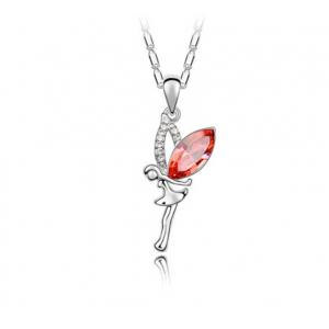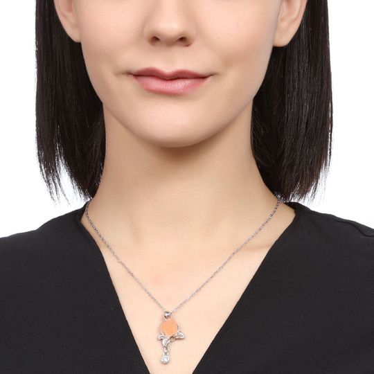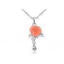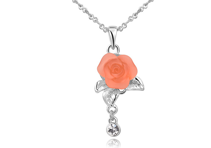 Lindo dije en baño de oro blanco de 18 quilates, diseño de rosa de cristal opaco en color melón y cristal blanco. Fabricado en una estructura de aleación de platino con rodio sin níquel.