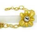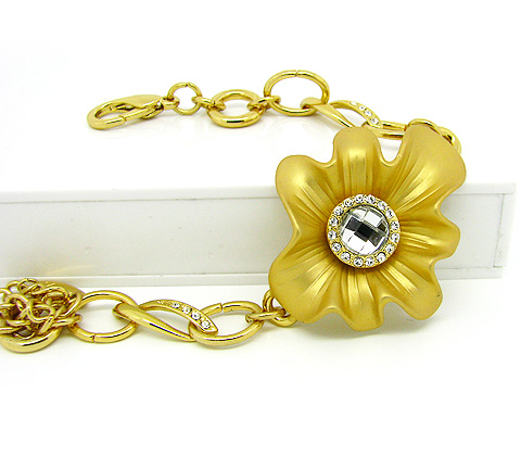 Original brazalete en baño de oro amarillo de 18 quilates diseño de flor acabado opaco, correa de eslabón grande e incrustaciones de cristales blancos. Fabricado en una estructura de aleación de platino con rodio sin níquel.