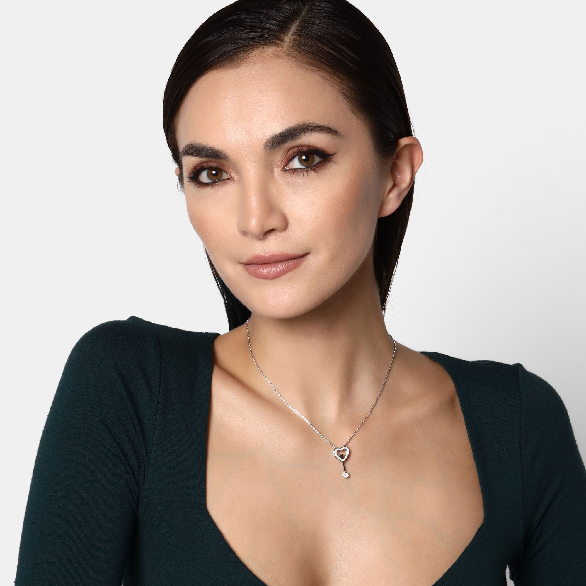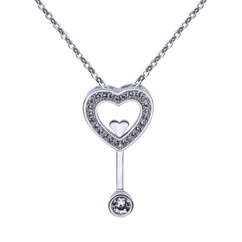 Tierno dije en baño de oro blanco de 18 quilates , diseño de corazón con incrustaciones de cristales en color blanco. Fabricado en una estructura de aleación de platino con rodio sin níquel.