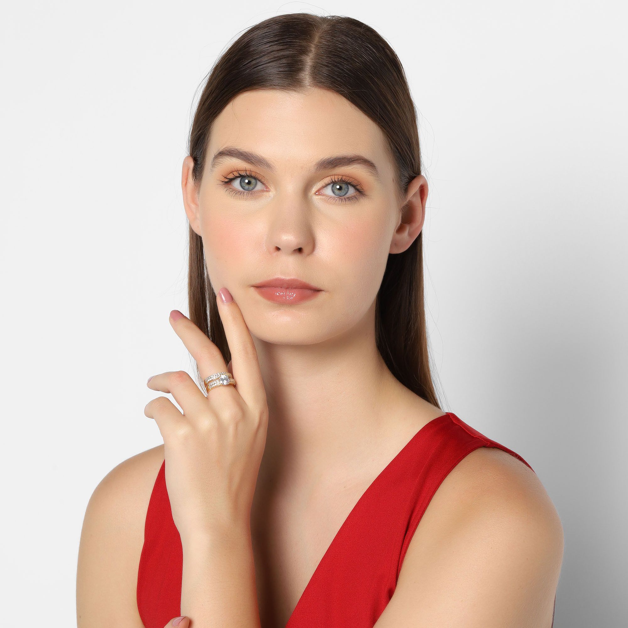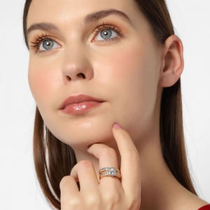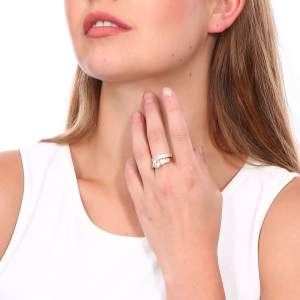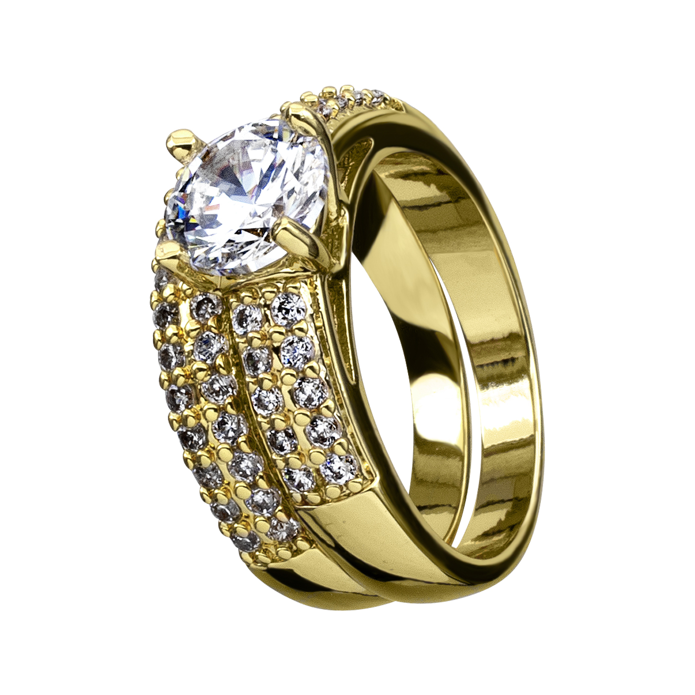 Precioso anillo en baño de oro amarillo de 18 quilates, precioso diseño de doble anillo con incrustaciones de cristales en color blanco. Fabricado en una estructura de aleación de platino con rodio sin níquel.
