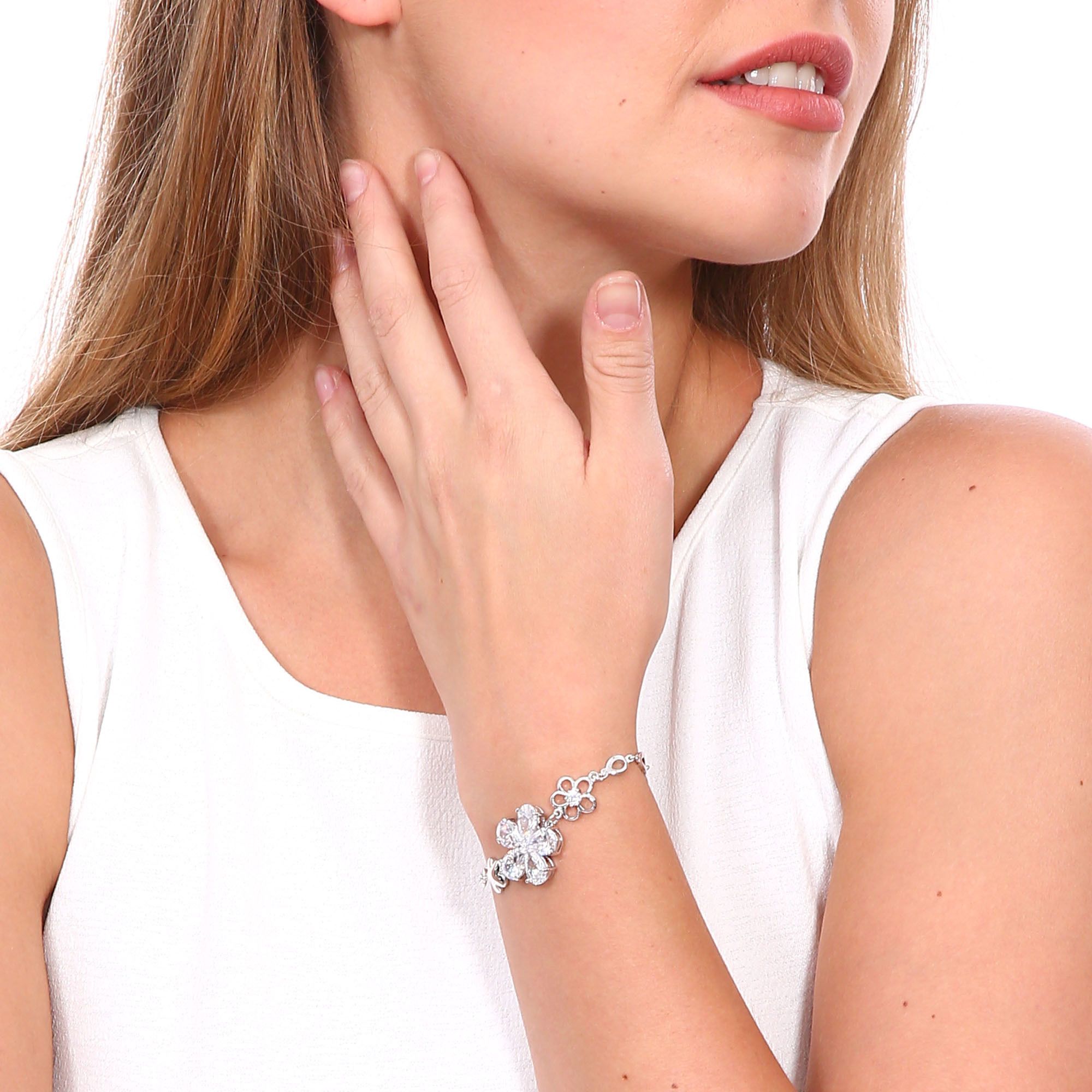 Hermosa pulsera en baño de oro blanco de 18 quilates, exquisito diseño de flores con incrustaciones de cristales en color blanco. Fabricado en una estructura de aleación de platino con rodio sin níquel.