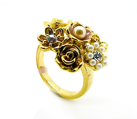 Fino anillo en baño de oro amarillo de 18 quilates, con detalle de flores en esmaltado y pátina negra, perlas en blanco y beige e incrustaciones de cristales blancos. Fabricado en una estructura de aleación de platino con rodio sin níquel.