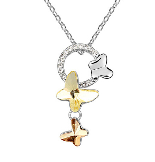 Lindo dije en baño de oro blanco de 18 quilates, con exclusivo diseño de mariposas sobre un aro con incrustaciones de cristales en color blanco y amarillo. Fabricado en una estructura de aleación de platino con rodio sin níquel.