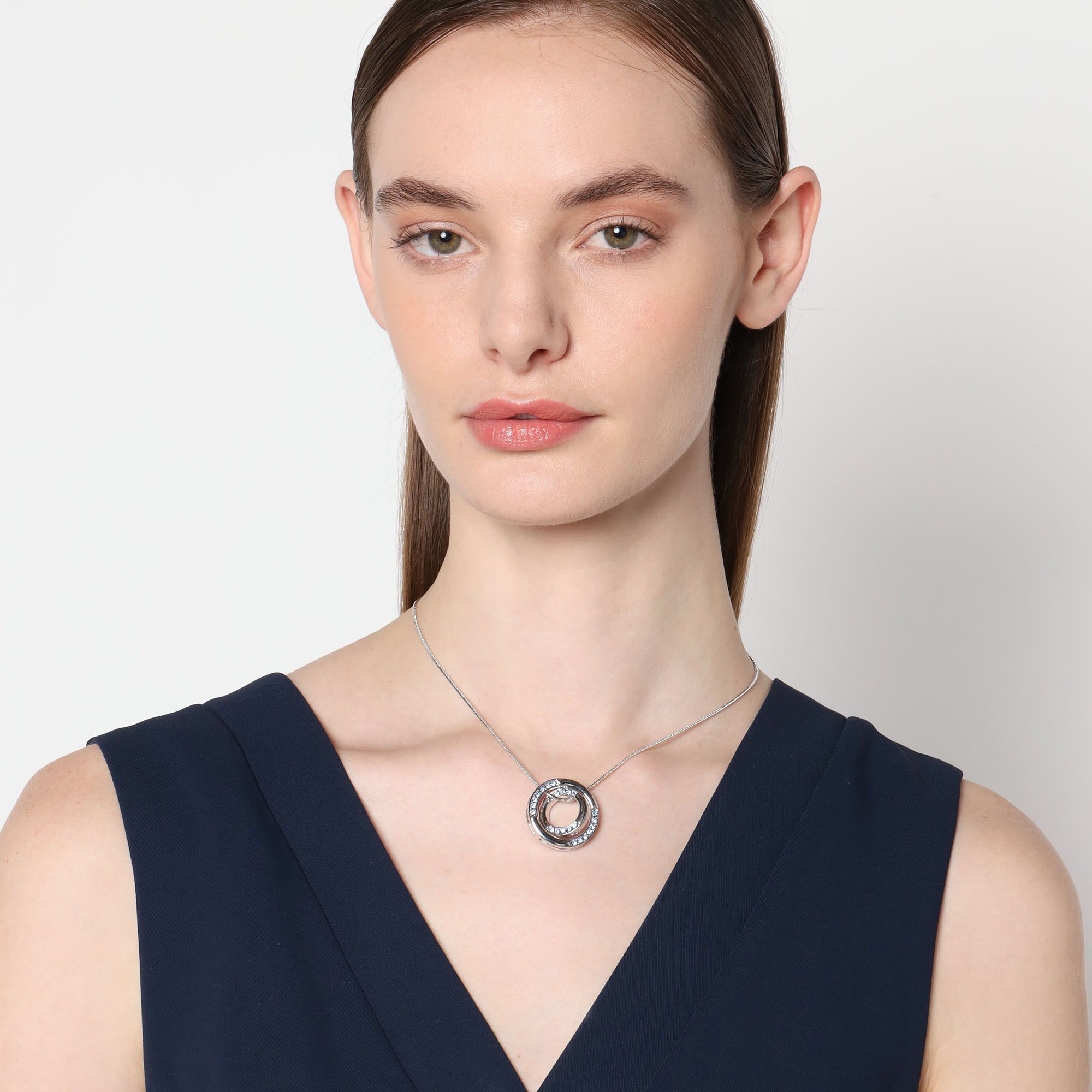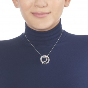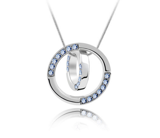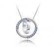 Dije con cadena en baño de oro banco de 18 quilates, diseño de aros con incrustaciones de cristales en color azul. Fabricado en una estructura de aleación de platino con rodio sin níquel.