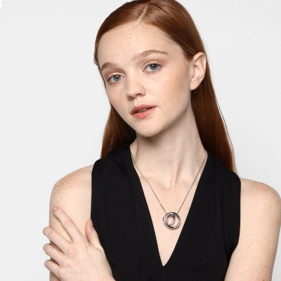 Dije con cadena en baño de oro banco de 18 quilates, diseño de aros con incrustaciones de cristales en color rosa. Fabricado en una estructura de aleación de platino con rodio sin níquel.
