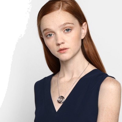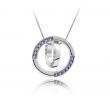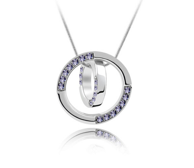 Dije con cadena en baño de oro banco de 18 quilates, diseño de aros con incrustaciones de cristales en color morado. Fabricado en una estructura de aleación de platino con rodio sin níquel.