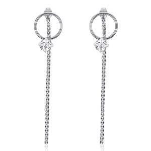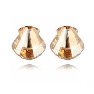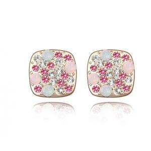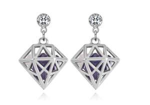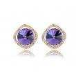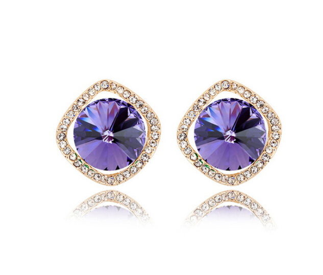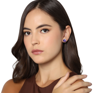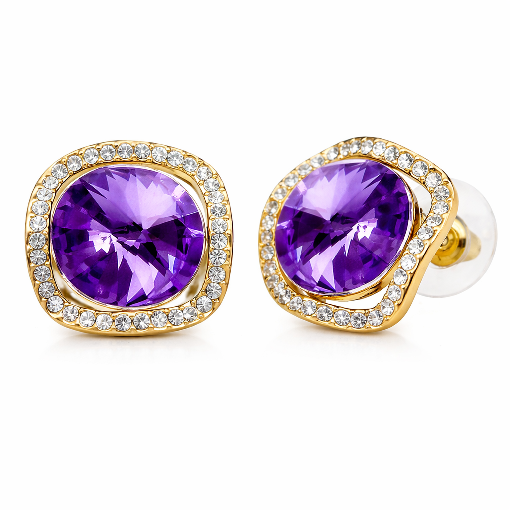 Aretes en baño de oro amarillo de 18 quilates, diseño de cuadro con cristal morado corte brillante e incrustaciones de cristales en color blanco. Fabricado en una estructura de aleación de platino con rodio sin níquel.